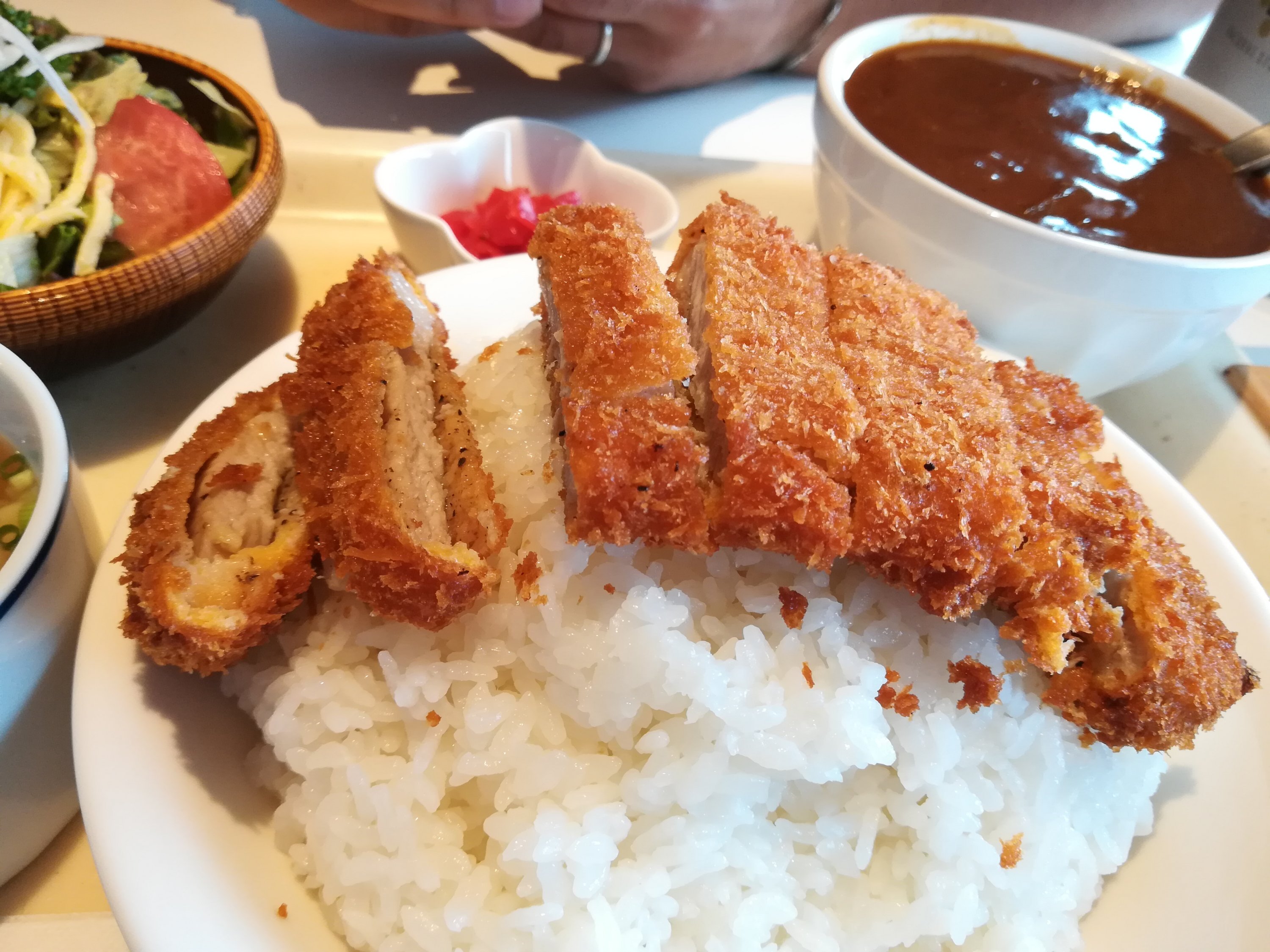 かなりのボリュームのカツカレーに、更にサラダ、スープもついていてきます。